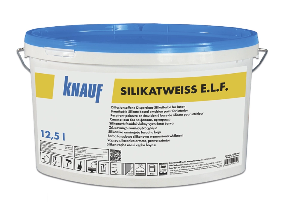 Diffusionsoffene, schadstoffgeprüfte, stumpfmatte Dispersions-Silikatfarbe für hochwertige Anstriche an Wände und Decken im Innenraum.